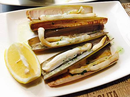 ✔︎Navajas a la Plancha 煎竹蛤:竹蛤 (竹蟶)在台灣比較少吃得到,一直是我最愛的蛤蚌類,他們家煎得不錯,又甜又Q!