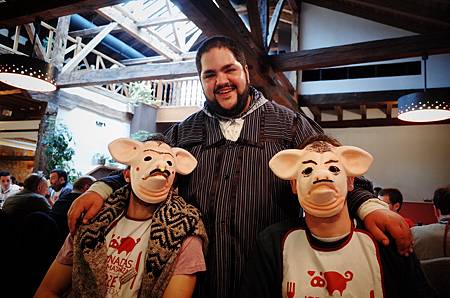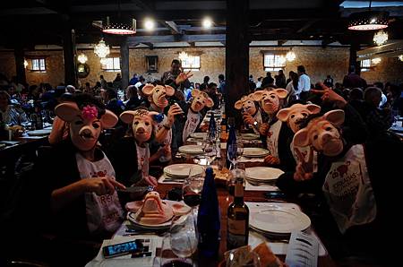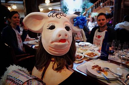 水晶球和布蘭卡這對情侶檔驚喜地為大家準備了好笑又creepy變態的豬仔面具和各式裝飾品,讓我們這群人從在小鎮的小酒館吧台前邊喝暖身酒邊創作專屬自己的豬臉開始、嗨到進入餐廳與大約400人一起歡樂地品嚐豬肉料理、直到傍晚六點進入小鎮的discoteca趴體到半夜,一路都是眾人矚目的焦點!
