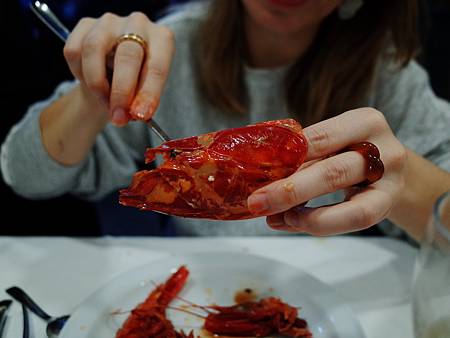 緋紅蝦雖然體型大,可是它的質地和味道完全超乎你的想像!肉質嫩中帶Q,像豆花般綿密、卻有龍蝦的彈性;味道更是一絕,鮮味、甜味、蝦味,通通勝過其他的大蝦小蝦,到了此生都不想再看到龍蝦的程度!最最最可怕的是蝦腦裡的膏液,好像濃縮10倍的蝦精華,吸吮完彷彿吸了毒,整個人進入涅槃的境界,不知身在何處,只懂吸吮手指與膜拜神蝦!吃時纏綿悱惻,吃完朝思暮想。水晶球和布蘭卡某次在家宴客,請我們一人吃一隻後,我就念念不完,深深回味,這次終於又讓我再次品嚐到。在此我就不多說,引用一篇誇張的中國食評「本人吃蝦18年,終於被這款網紅蝦好吃哭了」,給大家看看(笑笑):