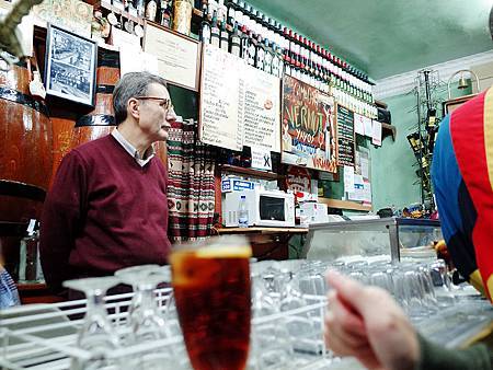 那麼為何還能留在心頭成為「心頭好」呢?因為老店就像是一顆時空膠囊,裡頭混合了牆上看盡盈虛的老酒瓶老塵埃、好幾世人客摩肩接踵的塵世喧嘩、以不變應萬變的草藥酒、親切機靈但不多話擾人的老酒保,也就組成了馬德里最迷人的陳腐氣味-馬德里的靈魂啊!至少我是這麼覺得的!