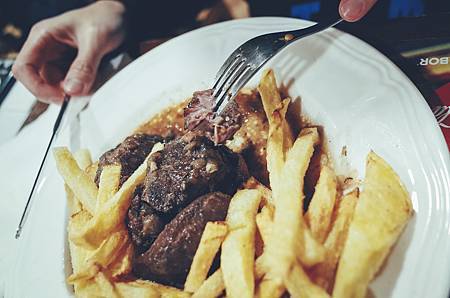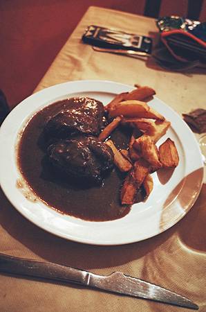 第二回 >>> 寄宿在此路最喜歡的小鎮Villafranca del Bierzo時,庇護所(青年旅館)的老闆娘大力推薦了鎮上一家餐館,我們便聽從她建議前往。菜單上又見紅酒燉豬頰肉這道特色菜,我忍不住再度點來吃,竟成為整路最難忘、最美味的一道菜!(行文此時還在懷念啊!)