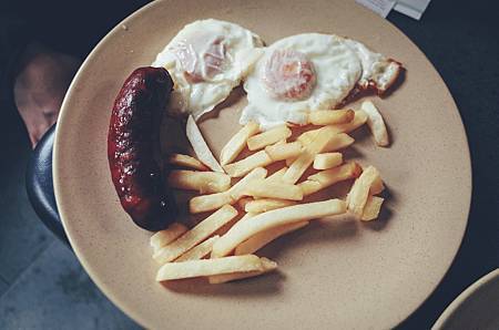 朝聖路上的第一次午餐:Chorizo、荷包蛋、薯條。