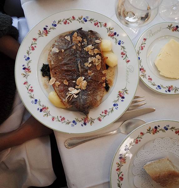 再次強調這魚真的做得很好,尤其是煎魚的火候一流,肉質柔嫩地入口即化。不過我們吃慣了用橄欖油烹調的地中海料理,實在吃不消使用如此厚重奶油的傳統法國料理啊!我最後非常辛苦地把它吃完了,而且還分了很大一部分給阿卡。我還是比較喜歡西班牙的魚料理,不論是橄欖油鐵板香煎、加利西亞水煮後淋橄欖油撒紅椒粉、橄欖油香料入烤箱,除了能吃到魚的原味外,負擔也比奶油少得多。