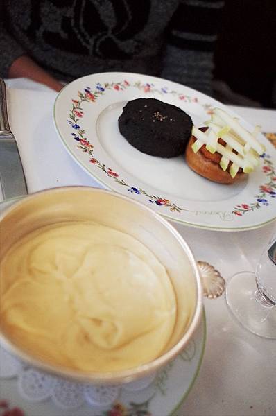 咱們好客戶的主菜是法式豬血腸(黑布丁)佐蘋果泥。這道榮登「今日最驚喜」,大家吃了都讚不絕口,雖然食材是粗獷的血腸,但老店做的風味與口感都非常細膩。