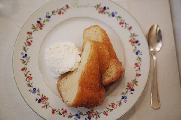 阿卡的甜點是Benoit的招牌薩瓦蘭蛋糕佐雅馬邑酒與新鮮鮮奶油,這道的法文一定要報一下:Savarin à l’Armagnac, crème fouettée。Armagnac雅馬邑酒,也有人翻為雅文邑酒,可說是Cognac干邑酒的表親;由於生產過程不像干邑需將葡萄酒二次蒸餾,因此不似干邑那麼精緻,口感較為粗獷,可也較有個性,各有支持者與愛好者。如果吃到這裡大家還沒飽到崩潰,那麼請必定要點這道甜點!侍者會端上兩瓶Armagnac雅馬邑酒讓你選擇,看是要比較清爽的還是比較濃烈的(阿卡當然選了濃烈的);還會帶來鐵桶裝的新鮮鮮奶油,在桌邊為你斟上你想要的份量。