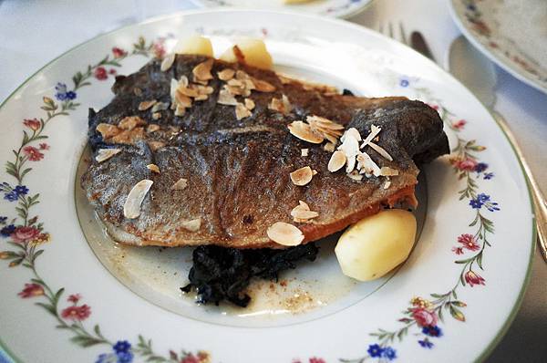 我的主菜是鱒魚佐馬鈴薯。這道魚真的做得很好,雖然味道裡沒有太多層次,就是夢幻的奶油味一路到底入魂,但是我的味覺體驗卻有好幾個階段: