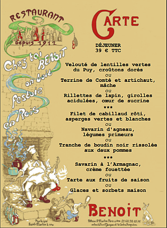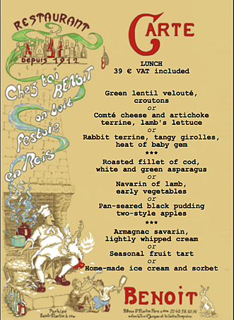上網查詢價格實惠的米其林餐廳時,發現了這家1912年開張的百年老酒館,被法菜教父Alain Ducasse併入旗下後隨即得到米其林一星加持,做的仍是原汁原味的小酒館Bistro料理,而且還有划算到不行要價才39€的午間套餐,當下就訂了位。行文此時發現網路上已經有許多關於Benoit的食記與評論,而且Alain Ducasse還把Benoit這套傳統法國酒館菜複製到東京與紐約,在兩地都開了分店。在此我就長話短說,紀錄一下我們當天吃了什麼,以及我與傳統法國料理第一次接觸的感想。